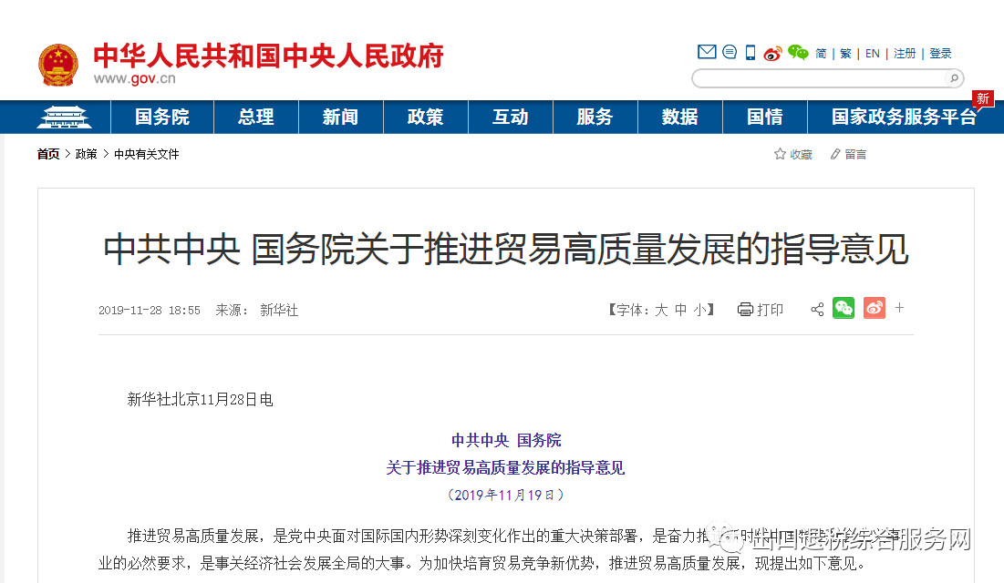 11月28日,《中共中央、国务院关于推进贸易高质量发展的指导意见》(下称《意见》)公布。