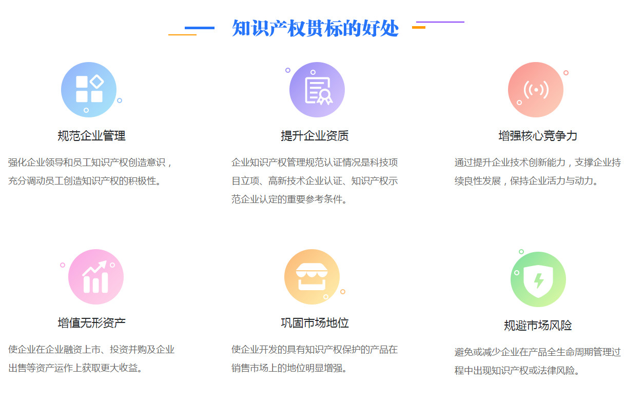 知识产权贯标对于企业来说,就是贯彻《企业知识产权管理规范》国家标准,其核心主旨就是为建立企业知识产权工作的规范体系,指导和帮助企业进一步强化知识产权创造、运用、管理和保护,增强自主创新能力,实现对知识产权的科学管理和战略运用,提高国际、国内市场竞争能力。