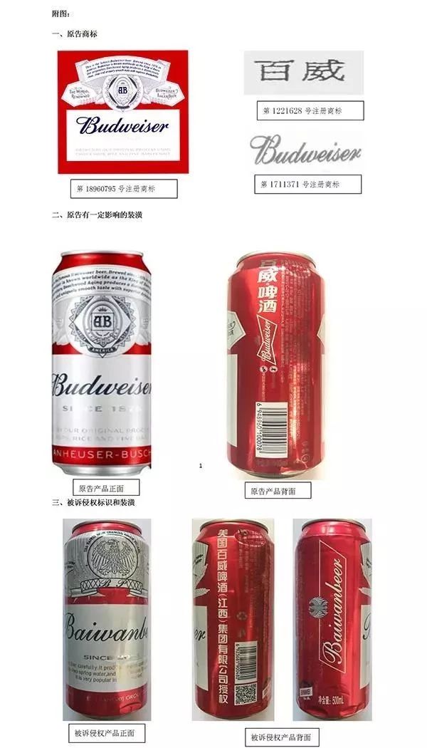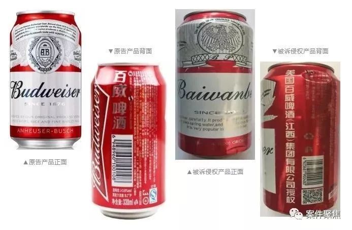 原告认为,被诉侵权产品的整体装潢要素侵害了原告第18960795号注册商标专用权;罐体上突出使用的字样侵害了原告第1221628注册商标专用权;罐体正面及侧面“Baiwanbeer”字样侵害了原告第1711371注册商标专用权。