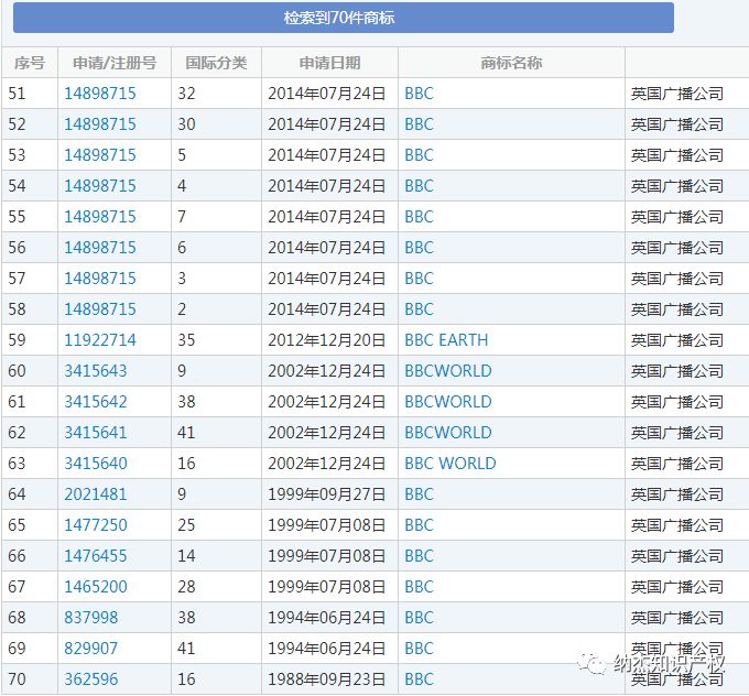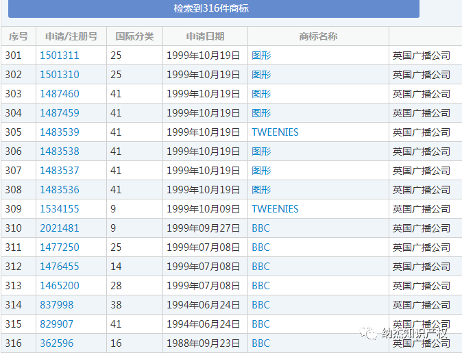 从下图中我们可以看到,英国广播公司很早就开始在中国申请商标了,到目前为止有316件的商标受我国商标法的保护,并且还几乎涵盖了所有类别。